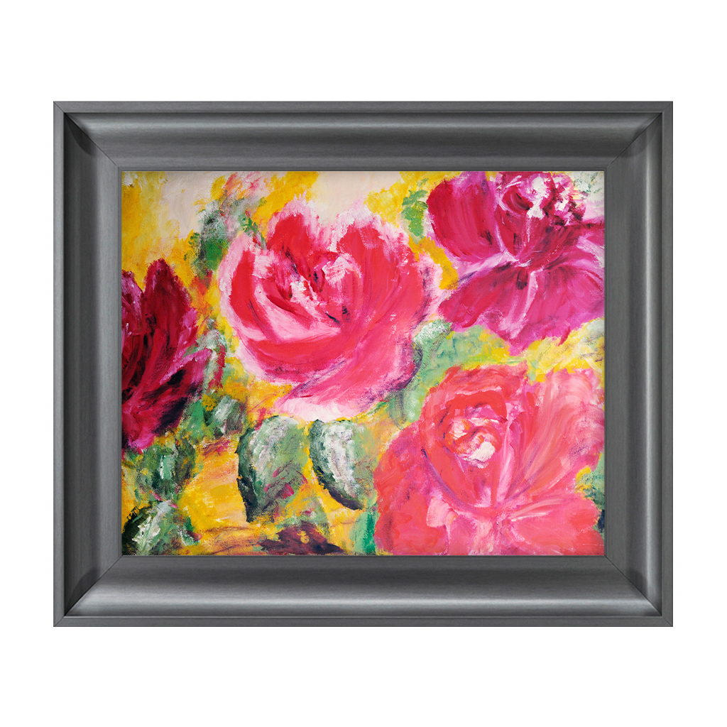 Reprodukcja malarstwa Elżbiety Turkowiak. Najczęściej przewijającym się motywem wśród dzieł Elżbiety jest róża. Poświęciła jej symbolice temat pracy dyplomowej oraz setki płócien. Oryginalne wymiary pracy (akryl na płótnie) to również 50×70. Fotografia: Bartosz Turkowiak / Donum Artis.